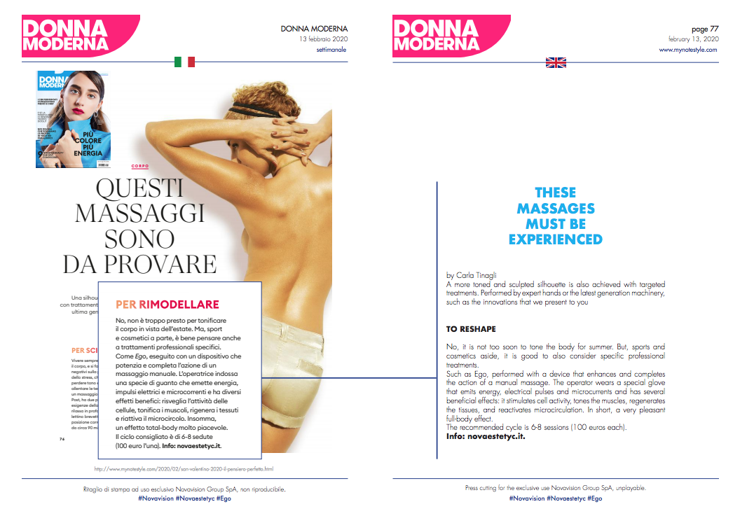 Home/ Press Review/ These massages must be experienced/ These massages must be experienced Fonte: Donna Moderna Pubblicazione: February 19, 2020 Scarica il file PDF Ritaglio di stampa ad uso esclusivo Novavision Group SpA, non riproducibile.